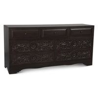 This hand-crafted dresser is made from solid mango wood with a medium brown lacquer finish around the exterior, and features a hand-carved circular pattern across the front in a darker brown finish providing the two tone effect unique to the Vallarta collection. The dresser has three small drawers across the top and four drawers stacked evenly along either side of the dresser, each with a modern style, bronze metal handle. This dresser is pre-assembled.
